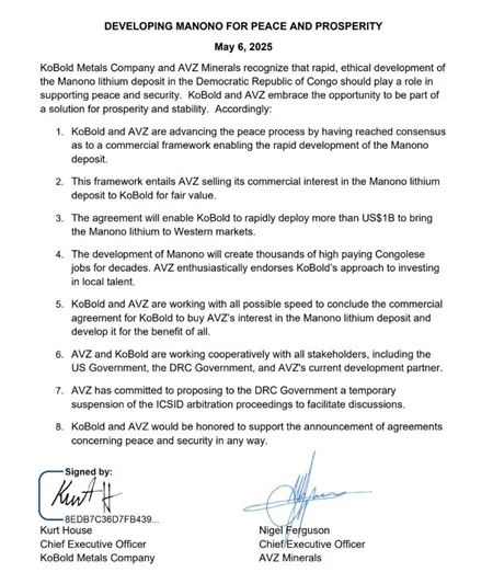 In the latest twist of events, Kobold now avers that the #Manono Mine deal is part of the peace deal between DRC and Rwanda brokered by US President Trump. In May 2025, Kobold even signed a framework agreement to the tune of USD one billion to compensate AVZ and to be in a position to develop the mine.